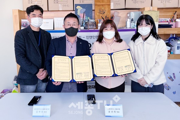 세종특별자치시사회복지협의회(회장 김부유, 이하 ‘협의회’)와 인앤인연구소 협동조합(대표 윤선희, 이하 ‘인앤인연구소’)은 17일 관계자 10여명이 참석한 가운데 복지사각지대 삶의 질 향상을 위한 다각적 사회공헌활동을 전개하는 데 협력하고자 업무협약을 체결했다.