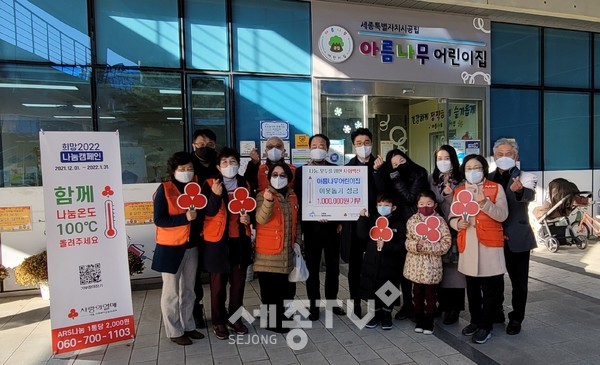 올해도 국공립 아름나무어린이집이 성금 100만 원, 아름동자율방범대가 20만 원을 각각 기탁해 희망2022나눔캠페인 사랑의 온도를 높였다.