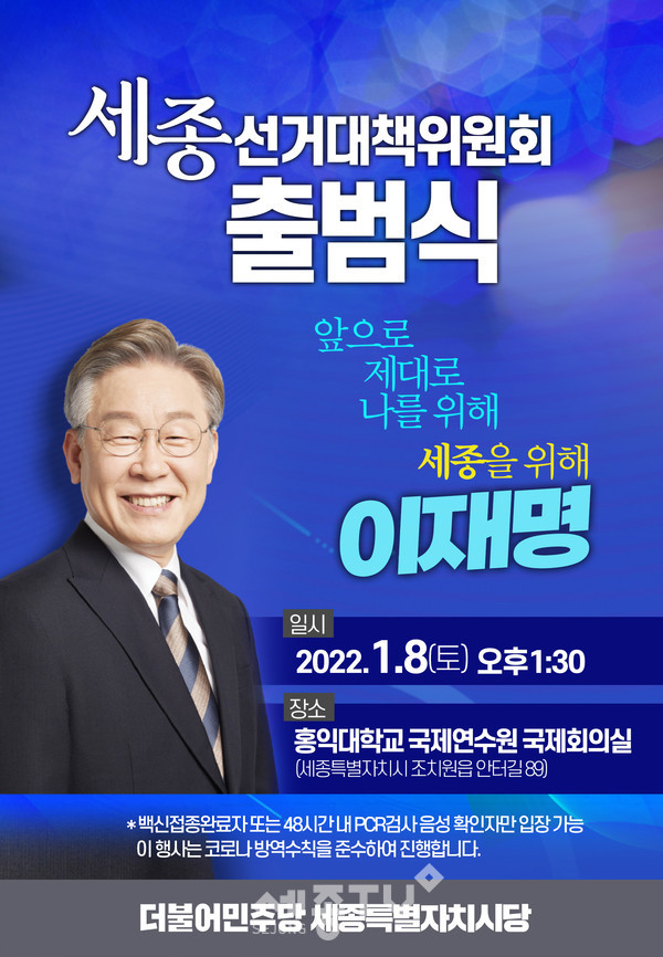 이날 행사는 코로나19 방역을 엄수해 인원제한과 함께 백신접종 완료자 또는 48시간 내 PCR검사결과 음성 확인자만 입장이 가능하며, 민주당 유튜브인 델리민주와 세종시당 유튜브를 통해 시청이 가능하도록 제공할 예정이다.