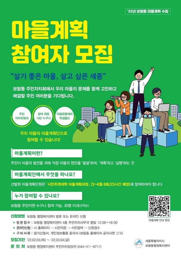 마을계획단 활동에 관한 자세한 사항은 보람동 행정복지센터 민원행정담당(☎ 044-301-6717)으로 문의하면 된다.