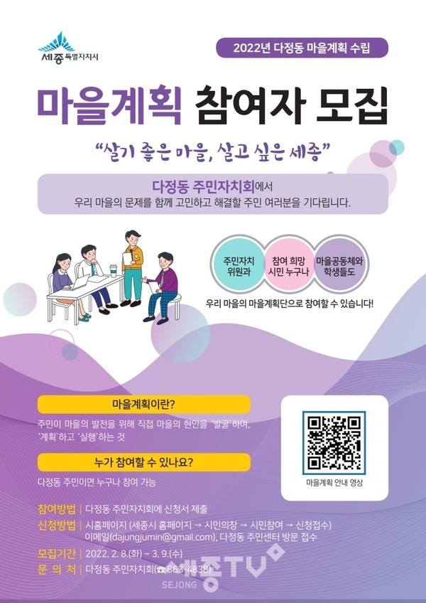 세종특별자치시 다정동 주민자치회(회장 고석은)가 주민이 직접 마을의 현안 과제를 발굴하고 문제 해결방안을 제시해 마을민주주의를 구현할 마을계획단을 오는 3월 9일까지 모집한다.