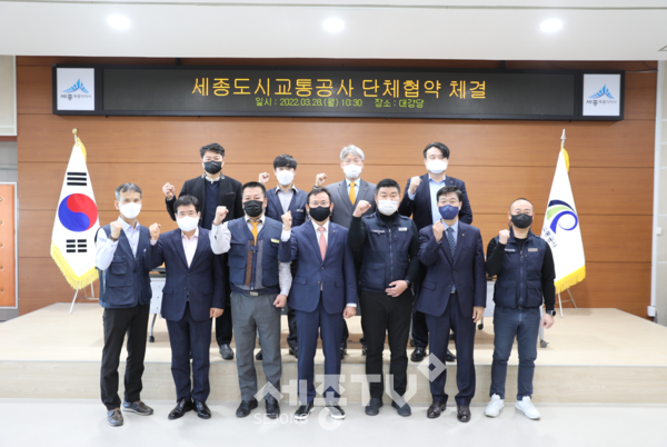 세종도시교통공사(사장 배준석)는 28일 조치원세종청사 3층 대강당에서 교섭대표노동조합인 한국노총 충남세종자동차노조지부(지부장 배상협)와 전국지방공기업노동조합연맹 세종도시교통공사 조합(위원장 이은구)의 연대 노동조합과 새로운 단체협약을 체결했다.