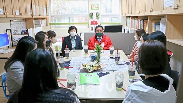 송명석 세종시 교육감 예비후보는 8일 오후 관내 어린이집을 방문하여 아이들과 교감하고 MZ세대 학부모들과의 간담회를 통해 격의 없는 소통의 시간을 가졌다.