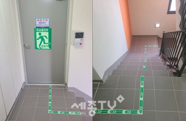 세종소방본부(본부장 최용철)가 아파트 화재 시 입주민들이 옥상 출입문을 쉽게 찾아 대피할 수 있도록 관내 아파트 단지 145곳에 안내표지와 피난 안내선을 설치했다고 26일 밝혔다.