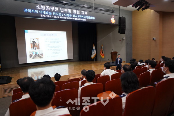 세종소방본부(본부장 최용철)가 지난 15일 시청 4층 여민실에서 본부 직원을 대상으로 반부패 청렴 교육을 실시했다.