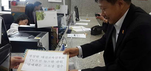 정상범 대전시교육감 후보가 ‘TV조선 뉴스 판’의 신모 기자를 명예훼손 혐의로 대전지검에 고소장을 접수했다.