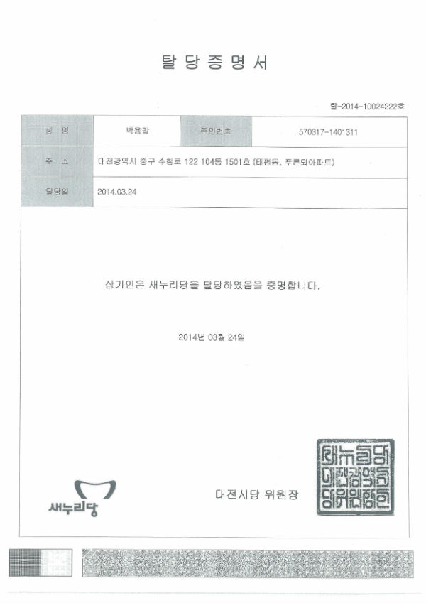 박용갑 새정치민주연합 대전시 중구청장 후보는 29일 한 일간지의 '이중당적 악몽 되풀이'라는 보도와 관련, "이중당적자가 아님을 분명히 알린다"고 해명하며 새누리당 탈당서류를 함께 제시했다.