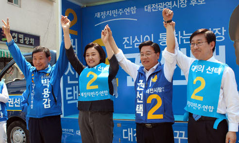 새정치민주연합 지도부가 31일 대전에서 막판 승기를 잡기위한 총력전을 펼쳤다. 박영선 원내대표는 이날 오후 1시 30분 중구 대흥동 성심당 앞에서 지원유세를 갖고 "기호 2번에게 몰표를 달라"고 호소했다.