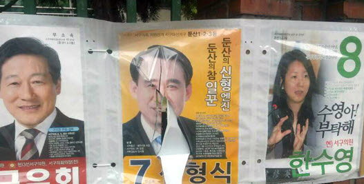 1일 신 후보 측에 따르면 전날 밤 둔산동 은빛유치원 앞, 한밭초 후문 앞, 세이브존 뒤 등 7개 지역에 부착된 신 후보의 얼굴 부분이 예리한 도구로 찢겨져 경찰과 선관위에 신고했다.