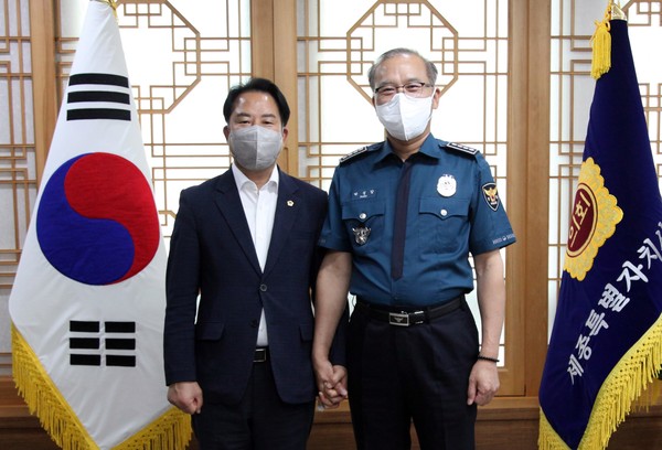 상병헌 의장은 박성갑 세종남부경찰서장과 황석헌 세종북부경찰서장을 각각 만난 자리에서 취임 축하 인사를 건네고 치안 유지를 위한 경찰 공무원들의 노고에 감사의 뜻을 전했다.