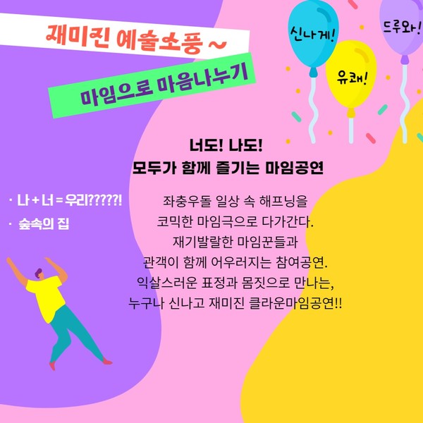 국제아트컴퍼니 몸 사회적협동조합의 재미진 예술소풍 ‘마임으로 마음나누기’ 문화향유 프로그램은 프로마임예술단체의 공연으로 누구라도, 말이 필요 없는 즐거움, 유쾌한 공연시간을 즐길 수 있는 예술소풍을 위한 프로그램으로 구성했다.