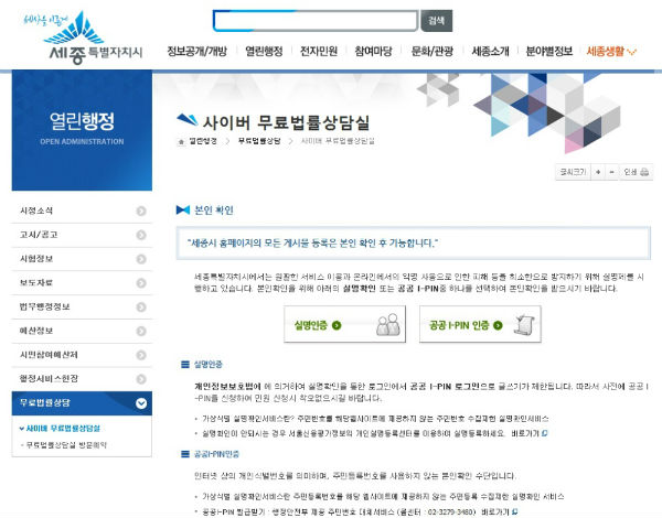 세종특별자치시는 16일부터 일상의 각종 법률문제에 대한 시민의 어려움 해소를 위해 시 홈페이지(www.sejong.go.kr)에 사이버 무료법률상담실을 개설, 운영키로 했다.