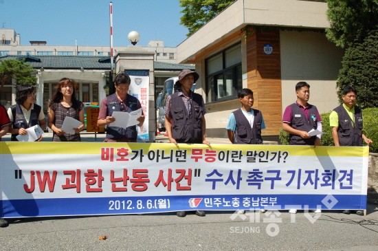 최 본부장은 6일 오전 10시30분 충남지방경찰청 앞에서 기자회견을 갖고 “이번 사건은 분명 사측의 사주로 벌어진 일임을 확신하지만 경찰 당국은 사건 발생 2개월이 다되어가고 있는 현재 까지도 피의자의 신분조차 파악하지 못하고 있다”며 “우리가 납득하기 어려운 것은 상식의 수준에서 차종이 특정된 차량 3대가 인적이 드문 새벽 운행되었음에도 불구 수십 수백 대의 방범용 CCTV를 갖추고 있는 경찰이 피의자는 물론 차량조차 특정하지 못하고 있다는 경찰의 변명이다”라고 주장했다.