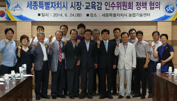 이춘희 세종시장 당선인과 최교진 시교육감 당선인이 24일 오후 인수위원회 위원들과 함께 세종농업기술센터 회의실에서 첫 모임을 갖고 세종시 발전에 대해 논의했다.