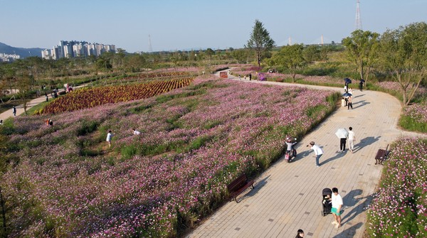 지난 9일 축제 개막에 맞춰 개방한 들섬 꽃단지에는 첫날부터 가을 정취를 만끽하는 관광객들로 인산인해를 이뤘다. 꽃길 곳곳에 설치된 포토존엔 가을 인생 사진을 찍는 사람들이 줄을 이었다.