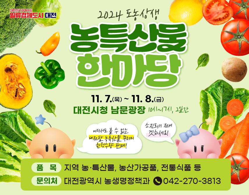 대전시는 지역 우수 농특산물에 관한 관심과 판로 확대를 위해 7일부터 8일까지 시청 남문광장에서 '도농상생 농특산물 한마당'을 개최한다.