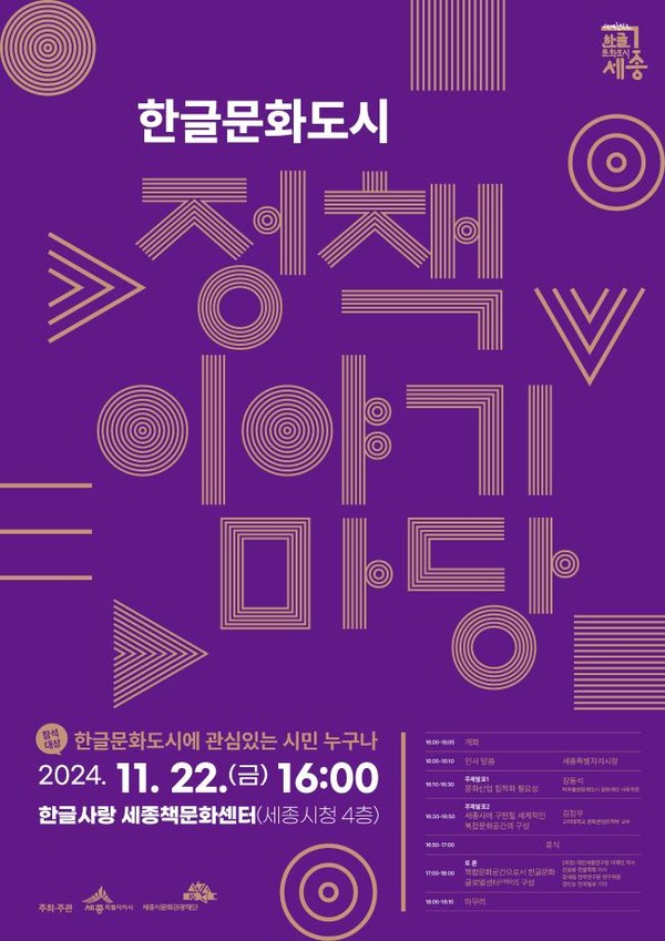 세종특별자치시(시장 최민호)와 세종시문화관광재단(대표이사 박영국)이 오는 22일 오후 4시 세종책문화센터에서 ‘한글문화도시 정책 이야기마당’을 개최한다.