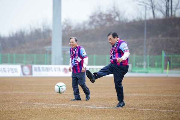 최민호 시장은 1일 세종시민운동장에서 열린 세종SA축구단과 대구FC B의 경기를 시축하고 창단 후 첫 홈경기에 나서는 세종SA축구단의 선전을 기원했다.
