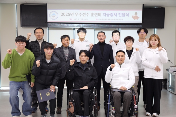 세종시장애인체육회(회장 최민호)가 7일 지난해 각종 대회에서 우수한 성적을 거둔 선수 14명에게 우수선수 훈련비 지급 증서를 전달했다.