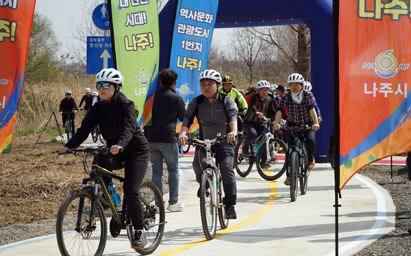 이날 행사엔 윤병태 나주시장과 김영우 영산강환경유역청장, 이재남 시의회의장, 최재웅 영산강홍수통제소장을 비롯해 자전거동호회원, 마을 주민 등 100여명이 참석했으며 개통식을 겸한 안전 점검 행사도 함께 진행됐다.