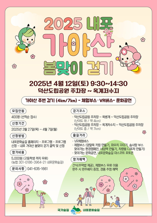 이용길 도 산림휴양과장은 “내포 가야산의 정취를 느끼고, 몸과 마음을 힐링할 수 있는 걷기 행사에 많은 관심과 참여를 부탁드린다”고 말했다.