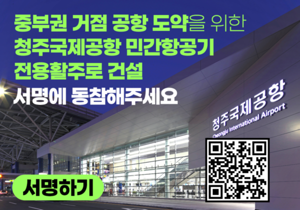 충북도가 4월 14일(월)부터 6월 말까지 청주국제공항에 민간 전용 활주로 건설을 촉구하는 주민서명운동을 전개한다고 밝혔다.