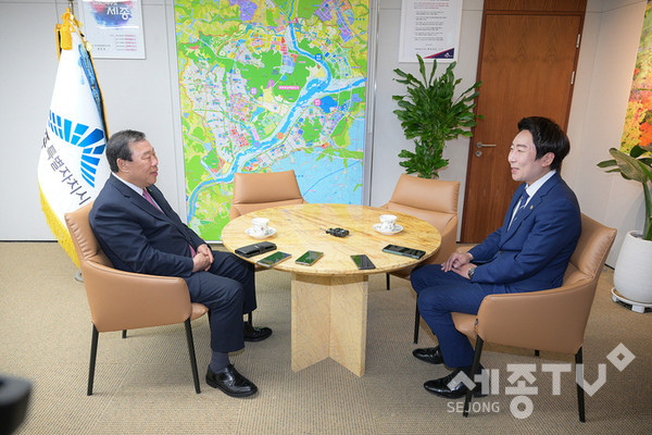 최민호 시장은 19일 시장 집무실에서 임채성 의장을 만나 행정수도 완성에 대한 시민들의 관심이 어느 때보다 높은 상황에서 향후 행정수도 세종 완성 대응 방안 등에 대해 의견을 나눴다.
