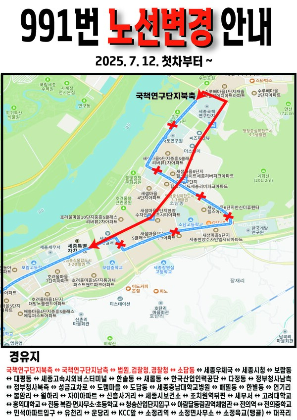 시는 운수 종사자의 피로도 등을 고려해 991번의 우회 구간을 최소화하고 남세종로 대신 한누리대로를 경유해 운행시간을 약 10분 단축했다.