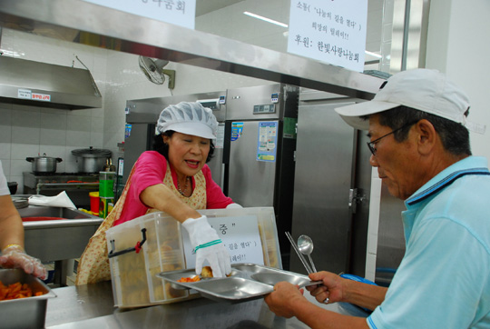 사진설명=한빛사랑나눔회 정숙자 회장이 장애우 아들의 수술비에 쓰려고 모아놓은 돈을 단체 공익성금으로 내놔 감동을 주고 있다. 사진은 정숙자(왼쪽) 회장이 복지관에서 지역노인들에게 무료급식 봉사 활동을 펼치고 있는 모습.