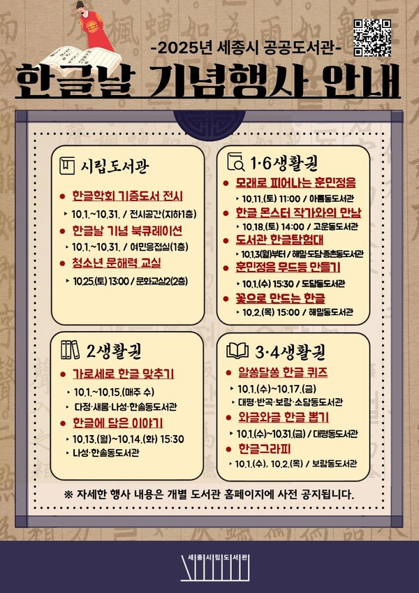 【SJB세종TV=경수진 기자】 세종시 공공도서관이 제579돌 한글날을 기념해 10월 한 달간 한글의 소중함을 되새기고 한글을 즐겁게 체험할 수 있는 다양한 기념 행사를 운영한다.