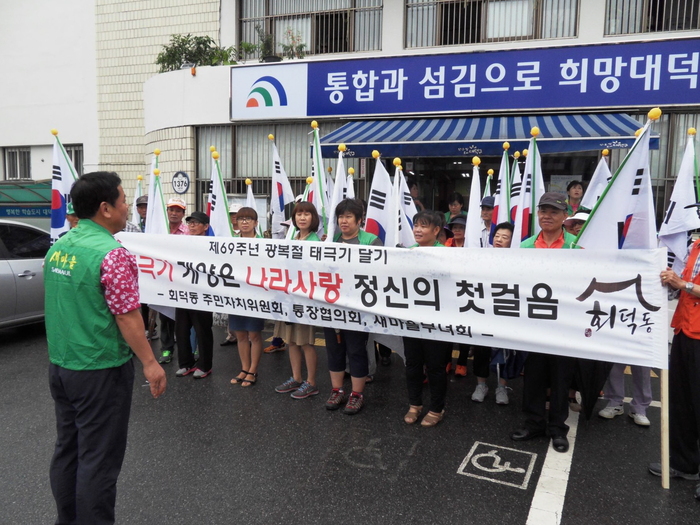대전 대덕구 회덕동(동장 장민순)은 지난 14일 자생단체 회원 등 80명이 참석한 가운데 동주민센터 인근 상가지역을 순회하며 제69주년 광복절 나라사랑 태극기달기 캠페인을 전개했다.