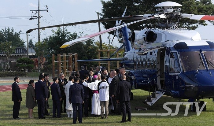 안희정 충남도지사는 17일 서산에서 헬기를 타고 도착한 프란치스코 교황을 영접했다.