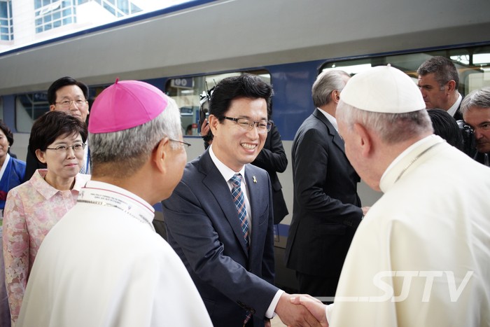 지난 15일 오전 KTX를 타고 대전역에서 내린 프란치스코 교황을 유흥식 천주교 대전교구장과 허태정 유성구청장, 권선택 대전시장 등 10여 명의 영접단이 환영했다.