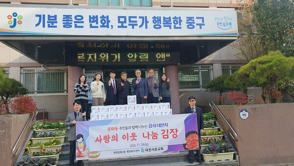 강민 동장은 “나눔과 봉사를 몸소 실천하는 서문교회에 진심으로 감사드린다”며 “정성이 담긴 김장김치를 관내 어려운 이웃에게 소중히 전달하겠다”고 답했다.