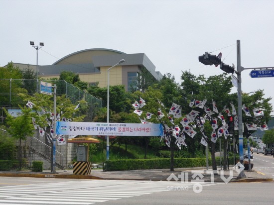 대덕구 송촌동 동춘당근린공원 네거리 가로수에 태극기가 주렁주렁 달린 태극기 나무가 생겼다.