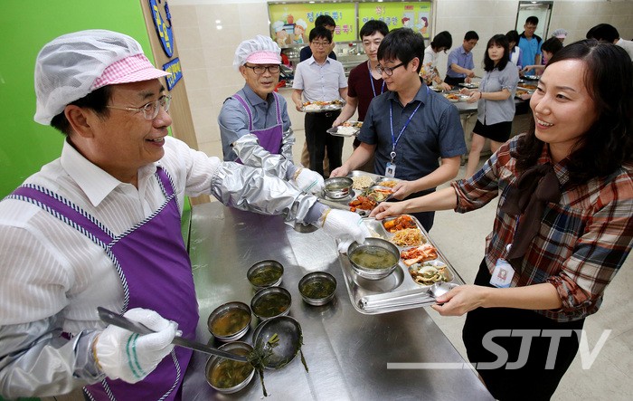 대전 동구 한현택 구청장이 12일 점심시간에 구청 식당에서 직접 국을 떠주며 400여명의 직원과 소통하는 시간을 가졌다.
