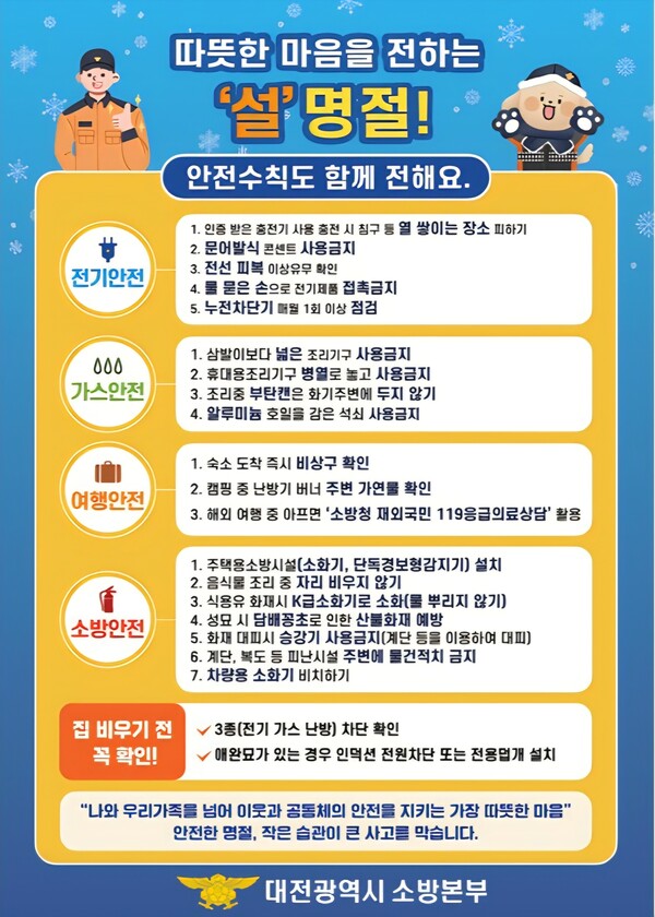 대전소방본부 관계자는 “설 연휴 기간에는 작은 부주의가 큰 사고로 이어질 수 있는 만큼, 가정 내 전기․가스 사용 안전 등 기본적인 화재 예방 수칙을 철저히 지켜주시길 바란다”며 “시민 모두가 안심하고 명절을 보낼 수 있도록 현장 대응과 예방 활동에 최선을 다하겠다”고 말했다.