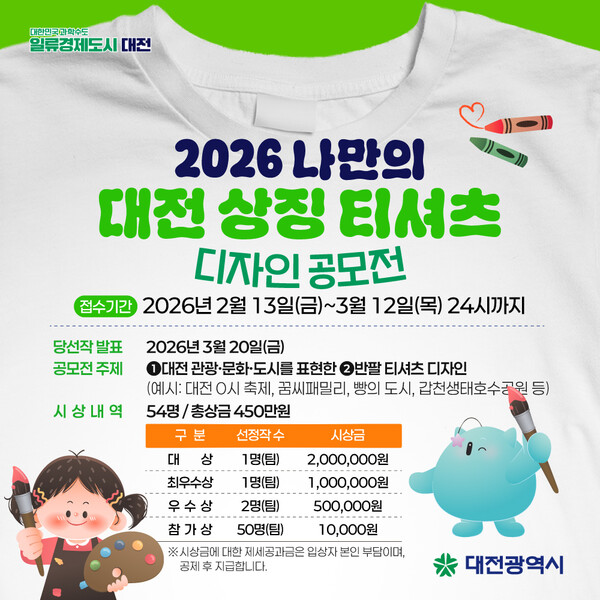 【SJB세종TV=박해연 기자】 대전시는 올해 대중과의 소통을 강화하고 시민과 함께 만들어가는 축제를 구현하기 위해 ‘2026 대전 0시 축제 로고(EI) 디자인 공모전’과 ‘대전 상징 티셔츠 디자인 공모전’을 개최한다.