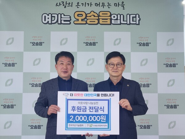 【SJB세종TV=서재일 기자】 오송읍행정복지센터는 19일 한국치산기술협회에서 관내 저소득층 가구를 위해 사용해 달라며 성금 200만원을 기탁했다고 밝혔다.