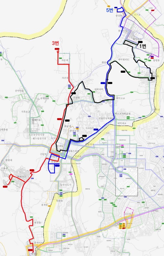 노선 조정에 따라 마을버스 3번과 5번 노선은 오는 20일부터 노선이 약 4㎞(편도)가 연장돼 도안신도시의 한라비발디, 도안휴먼시아4단지 아파트, 학하지구의 미학아파트, 학의뜰아파트 등을 지나게 된다.