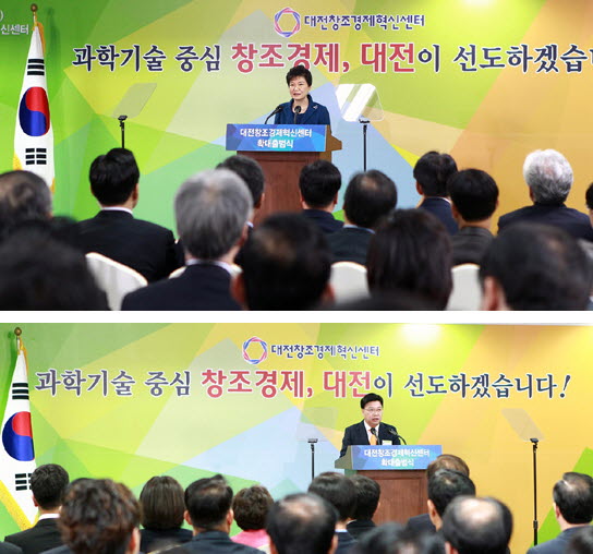 10일 오전 대전 한국과학기술원(KAIST)에서 열린 대전 창조경제혁신센터 확대 출범식에 참석한 박근혜 대통령과 권선택 대전시장이 인사말을 하고 있다. 저작권자 © SJB세종TV 무단전재 및 재배포 금지 세종TV 다른기사 보기 페이스북 트위터 카카오톡 네이버블로그 구글+ URL복사 기사공유하기