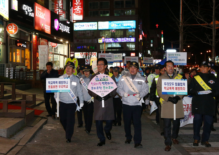 대전 유성구는 11일 저녁 노은역 시계탑 광장에서 허태정 유성구청장과 오용대 대전둔산경찰서장, 자율방범대, 지역 주민 등 100여 명이 참석한 가운데 학교폭력예방 민·관·경 합동 거리 캠페인을 펼쳤다.