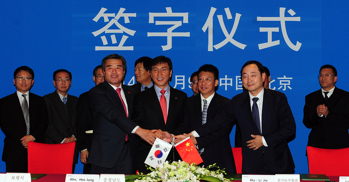 안 지사는 9일 마리지(马利杰) 신흥중신련그룹(XinXing China New United Imp&Exp Corp Group) 회장, 임민섭 ㈜KSP-신흥DIP 회장, 김동일 보령시장과 투자협약(MOU)를 체결했다.