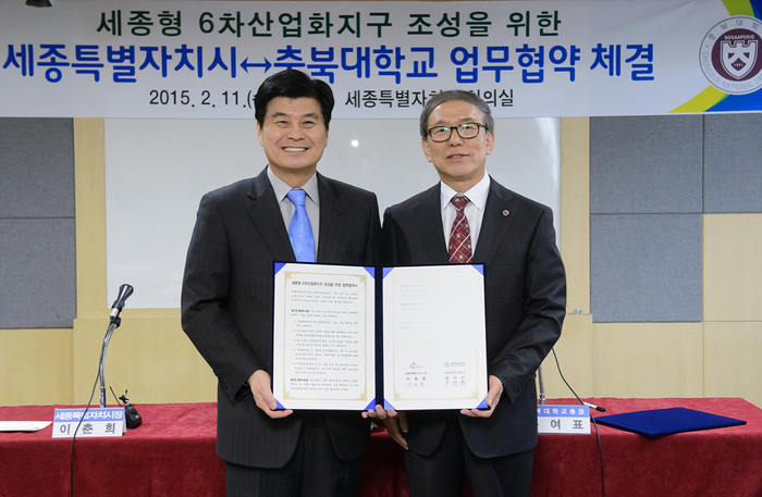 이춘희 시장은 11일 오후 시청 회의실에서 윤여표 충북대 총장과 세종시 전의면 일대 17만 평방미터(m2) 규모의 산업지구 조성을 위한 업무협약을 체결하고 2017년까지 해당지역에 생산과 제조, 가공과 체험, 관광, 힐링서비스가 융복합된 농업의 6차산업화 지구 조성에 나선다.