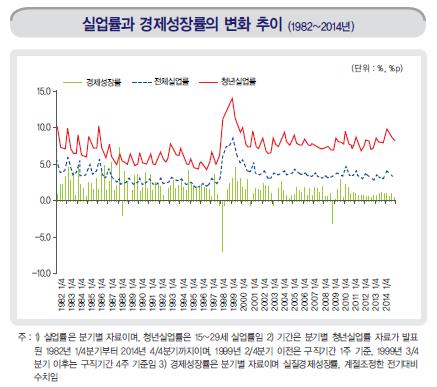 1982∼2014년 분기자료를 이용하여 분석한 결과, 우리나라는 오쿤의 법칙이 성립하고 있으며, 전체실업률보다 청년실업률과 경제성장률 간에 오쿤의 법칙이 강하게 나타나고 있다.