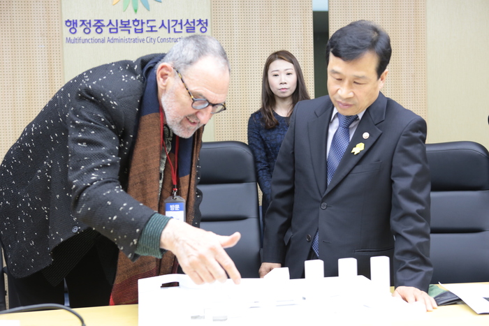 미국 캘리포니아 출신의 세계적 건축가 탐 메인(Tom Mayne, 가운데)이 16일 행정중심복합도시건설청을 방문, 이충재 행복청장(맨 우측)에게 행정중심복합도시 방축천 상업용지의 특화방안에 대해 자신의 입장을 설명하고 있다.