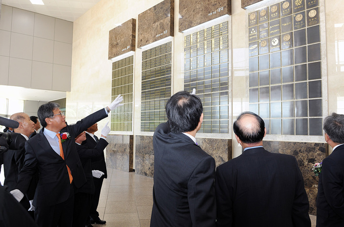 충남대가 발전기금 기부자들의 뜻을 기리고, 널리 알리기 위한 ‘명예의 전당’을 조성했다. 충남대 발전기금재단은 5월 22일 오전 11시, 중앙도서관 1층 로비에서 ‘명예의 전당 제막식’을 개최했다. 이날 제막식에는 정상철 총장과 故 정심화 이복순 여사의 가족대표 임채훈, 보령제약그룹 김승호 회장, 충청하나은행 함영주 대표, 군사학부 이종학 특임교수, 라이온켐텍 박희원 회장 등 100여명이 참석했다. 명예의 전당은 학생과 교직원, 외부인 등의 왕래가 가장 많고 대학 내에서 가장 상징적인 공간인 도서관에 조성됐다. 가로 10m, 세로 5.7m 크기의 대리석 위, 동판에 686명의 이름과 기부 금액이 새겨져 있으며, 터치스크린을 설치해 기부자 검색을 가능하도록 했다. 기부 금액에 따라 5개 클럽으로 분류되어 있으며, 30억원 이상 기부자인 ‘백마클럽’은 정심화 이복순 여사, SK 최종현 회장, 하나은행, 우리은행의 이름이 올려져있다. 10억원이상 기부자인 ‘영탑’은 이인구 회장 외 15명, 1억원 이상 기부자인 ‘대덕’에는 삼영기계 한금태 회장 외 57명, 5천만원 이상 ‘보운’에는 진합 이영섭 회장 외 55명, 1천만원 이상 ‘철쭉’에는 552명의 기부자 이름이 새겨 있다. 백마는 충남대의 상징 동물인 백마, 영탑은 영탑지, 대덕은 대덕캠퍼스, 보운은 보운캠퍼스, 철쭉은 충남대의 교화를 각각 상징하며 명예의 전당 명칭은 대학 구성원들의 선호도 조사를 통해 결정됐다. 충남대는 지난 1990년 발전기금 모금을 시작한 이래 2015년 현재까지 1만 4984명이 1130억 9172만여원을 약정했다. 특히, 정상철 총장은 지난 2012년 2월 취임 한 이후 현재까지 318억원의 발전기금을 모금하는 성과를 거뒀으며, ‘CNU 1대 1 장학멘토링 운동’을 추진해 구성원과 동문들의 자발적인 발전기금 기부 참여를 이끌어냈다. 정상철 총장은 “명예의 전당은 충남대학교를 사랑하는 분들의 마음을 영원히 기억하기 위한 공간이자 발전기금 모금 운동의 새로운 출발점이 될 것”이라며 “기부자들의 소중한 뜻이 담긴 발전기금이 인재양성과 대학발전에 활용될 수 있도록 노력하겠다”고 말했다.