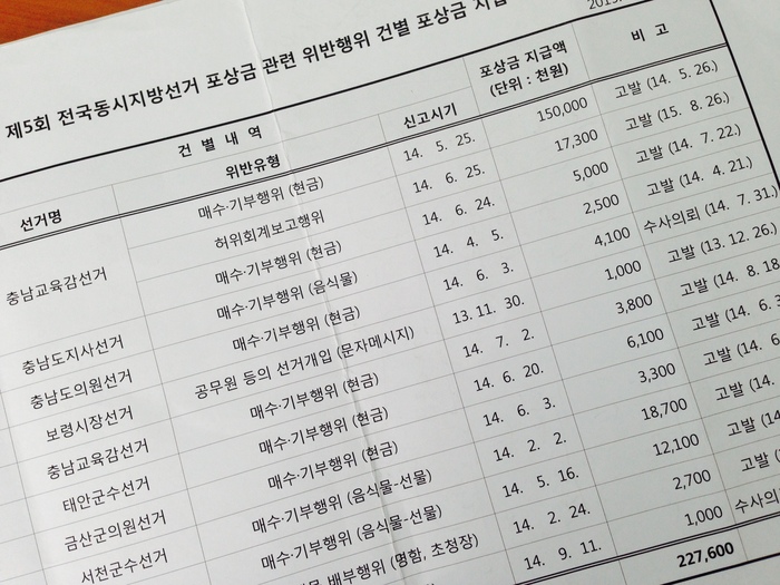 충남도선거관리위원회는 지난해 6월 4일 실시한 제6회 전국동시지방선거와 관련, 포상금심사위원회를 개최하고 불법 조직활동비 지급 및 추석·설 명절 금품 제공 등 선거·정치자금범죄를 신고한 14명에게 총 2억2천7백60여만원의 포상금을 이미 지난해 지급했다. 그리고 이에 대해서는 언론까지 어느 누구도 문제를 제기하지 않았었다.