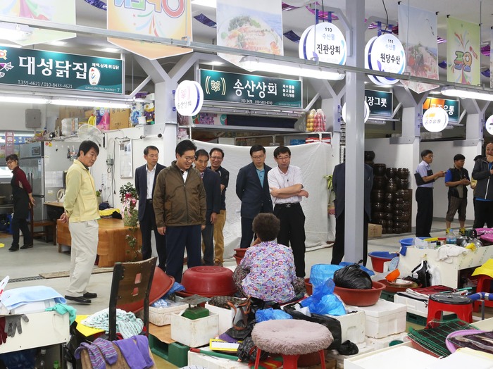 시에 따르면 김 시장은 이날 부시장과 관련 국장 및 부서장들과 함께 교육문화스포츠센터와 지난달 31일 임시 개장한 당진어시장 일원을 둘러봤다.